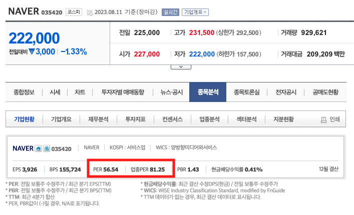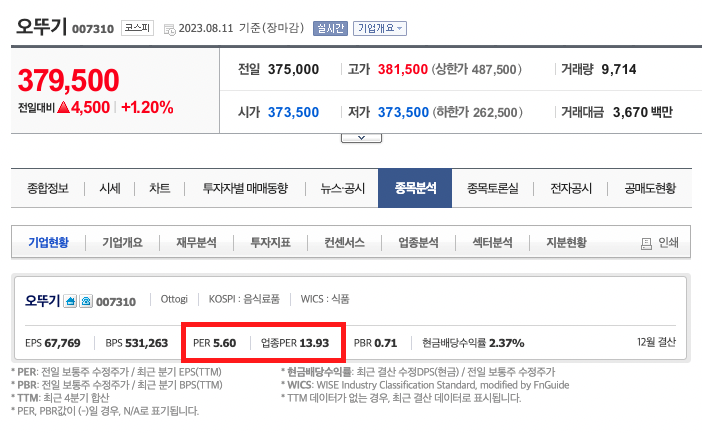 하지만 일반적으로 플랫폼, 소프트웨어 관련주들은 미래가치에 대해 높게 평가받기 때문에 비교적 PER이 높고, 오뚜기와 같은 식료품 관련주들은 PER이 낮게 형성됩니다. 그래서 보아야할 것이 동종 업계 PER입니다. 이는 같은 섹터에 묶여있는 주식들의 PER의 평균치를 나타내는 것으로 두 주식 모두 해당 업종의 다른 주식들에 비해 다소 저평가되어있구나 정도의 해석을 할 수 있습니다.