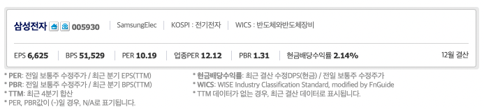 값을 구하는 건 알겠는데 대체 이게 의미하는게 무엇인지를 알아야 하고 어떻게 사용하는지도 알아야겠죠? 삼성 전자 주식을 예로 들어서 차근차근 설명해드리겠습니다.