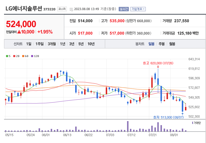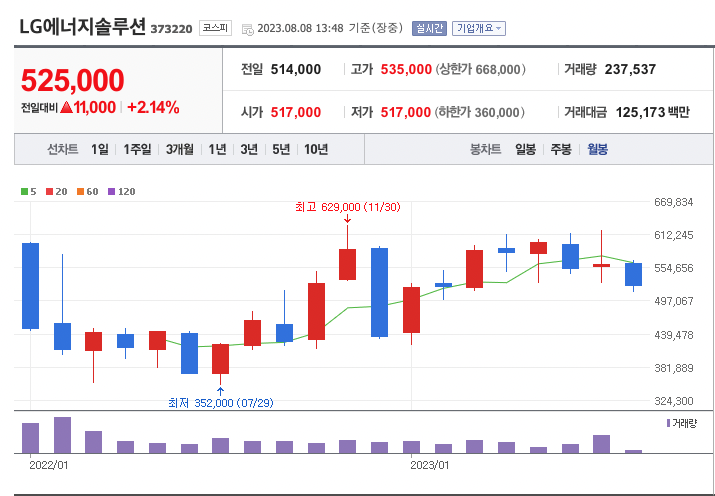 2차전지 관련 대형주로 상장한 에너지솔루션은 상장 당일 시초가 대비 15% 하락한 50,5000원에 마감되었고 이는 공모가 30만원 대비 68.3프로 상승한 수치입니다. 승승장구할 것 같았던 주가는 경제 침체 속에 반년간 하락 및 횡보하였으나 352,000원 최저점을 기록한 뒤에 최고가를 갱신하며 상승세를 이어가는 듯 했습니다. 하지만 우크라이나 전쟁 등 세계 경제 이슈 속에 22년 12월 주가는 곤두박질하며 많은 투자자들을 힘들게 하기도 했었습니다. 이후 배터리 시장의 호재와 악재가 엎치락 뒤치락 해가며 50~60만원 선에서 횡보하고 있는 모습입니다.